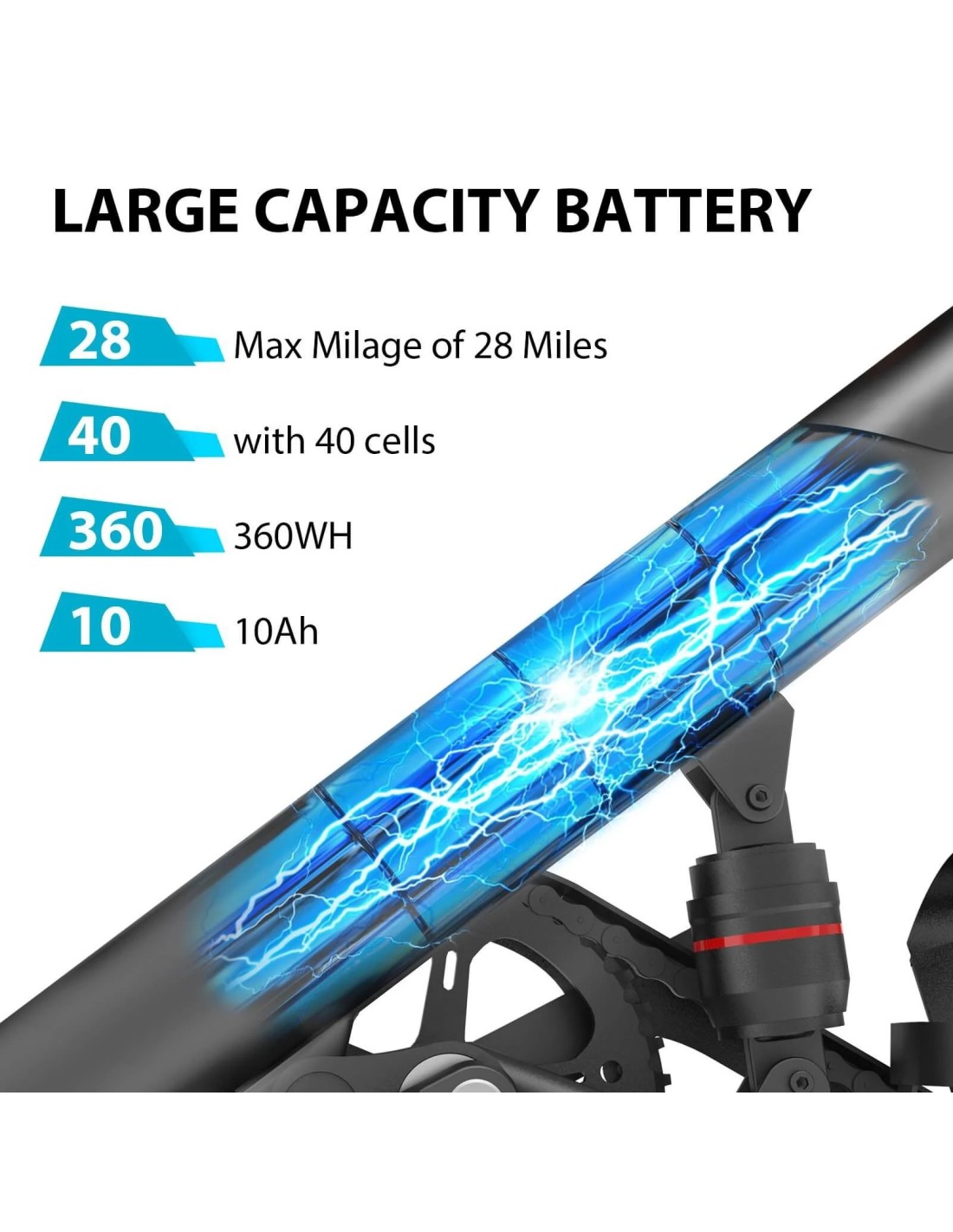 Batteria da 36 V 10 Ah e il potente motore supportano una velocità massima di 18 miglia orarie con un chilometraggio di 28-38 miglia.